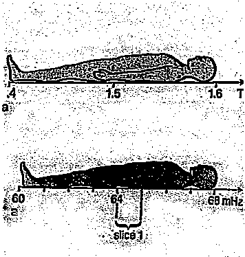 Applicando al sistema un gradiente di campo magnetico (slice selecting gradient) oltre al campo statico Bo, ogni differente sezione del corpo subisce l'azione
