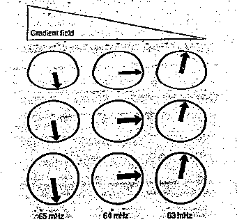 Applicando inoltre per un tempo breve un gradiente di campo come in fig.25 (phase encoding gradient), questo causa una temporanea accelerazione degli spins in funzione della diversa intensità di campo. Al cessare della sollecitazione questi precessano nuovamente alla stessa frequenza, ma sfasati fra loro. Il segnale che si ottiene da ogni colonna ha quindi la stessa frequenza, ma fase diversa per ogni riga.