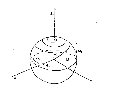 Quando si applica al sistema un campo a radiofrequenza B1, l'effetto è quello di allontanare il vettore di magnetizzazione M dalla situazione iniziale, in cui è diretto come il campo Bo, fino a fargli formare un angolo a che dipende dall' ampiezza del campo B1 ( fig. 6).